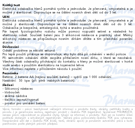 Elektrická odsávačka hlenů pomáhá rychle a jednoduše. Je přenosná, omyvatelná a je možné ji sterilizovat. Doporučuje se na čištění nosních dírek dětí od 0 do 3 let.