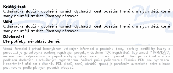 Odsávačka slouží k uvolnění horních dýchacích cest odsátím hlenů u malých dětí, které samy neumějí smrkat. Plastový nástavec.