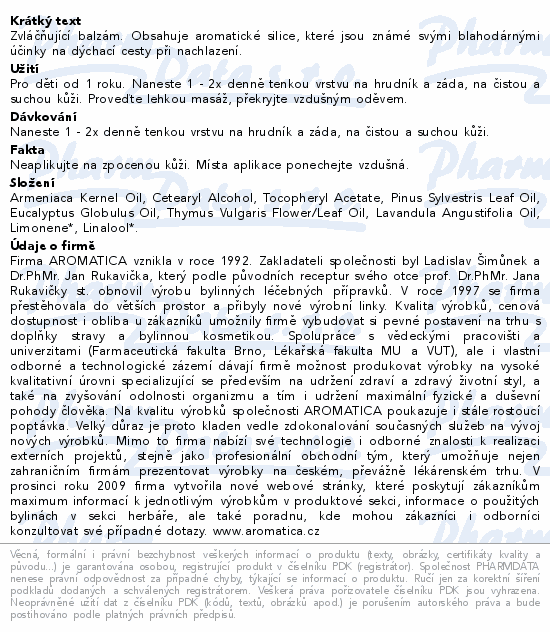 Zvláčňující balzám. Obsahuje aromatické silice, které jsou známé svými blahodárnými účinky na dýchací cesty při nachlazení.