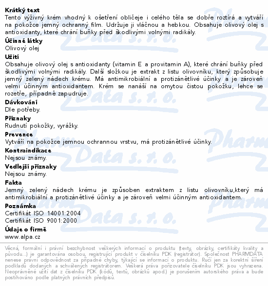 Tento výživný krém vhodný k ošetření obličeje i celého těla se dobře roztírá a vytváří na pokožce jemný ochranný film. Udržuje ji vláčnou a hebkou. Obsahuje olivový olej s antioxidanty, které chrání buňky před škodlivými volnými radikály.