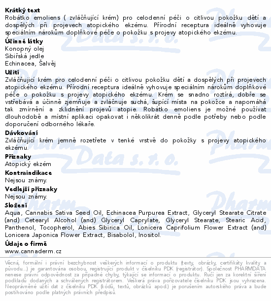 Robátko emoliens ( zvláčňující krém) pro celodenní péči o citlivou pokožku dětí a dospělých při projevech atopického ekzému. Přírodní receptura ideálně vyhovuje speciálním nárokům doplňkové péče o pokožku s projevy atopického ekzému.