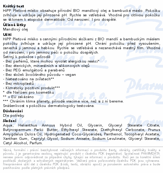 HiPP Pleťové mléko obsahuje přírodní BIO mandlový olej a bambucké máslo. Pokožku zvlhčuje a udržuje její přirozené pH. Rychle se vstřebává. Vhodné pro citlivou pokožku se sklonem k atopické dermatitidě. Od narození. I pro dospělé.