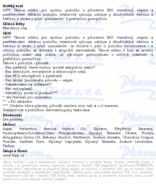 HiPP Tělové mléko pro suchou pokožku s přírodním BIO mandlový olejem a panthenolem dětskou pokožku intenzivně vyživuje, udržuje ji dlouhodobě vláčnou a hebkou a chrání ji před vysoušením. S praktickou pumpičkou.