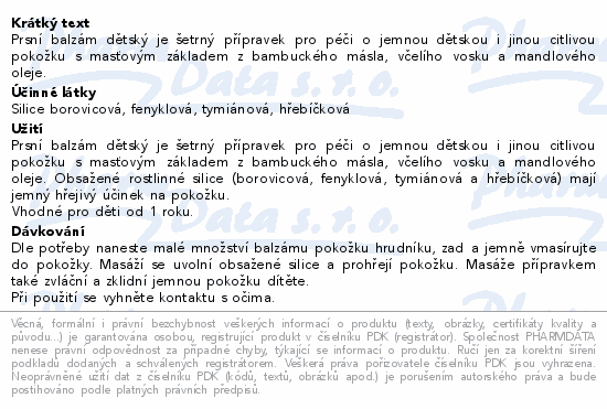 Prsní balzám dětský je šetrný přípravek pro péči o jemnou dětskou i jinou citlivou pokožku s masťovým základem z bambuckého másla, včelího vosku a mandlového oleje.