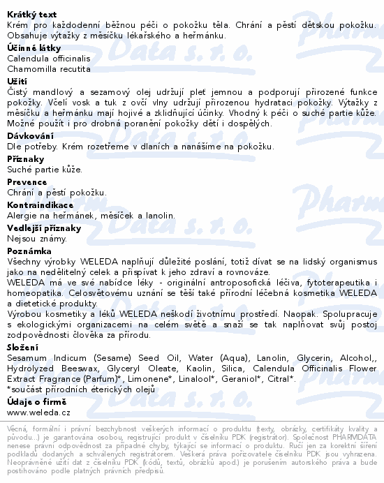 Krém pro každodenní běžnou péči o pokožku těla. Chrání a pěstí dětskou pokožku. Obsahuje výtažky z měsíčku lékařského a heřmánku.