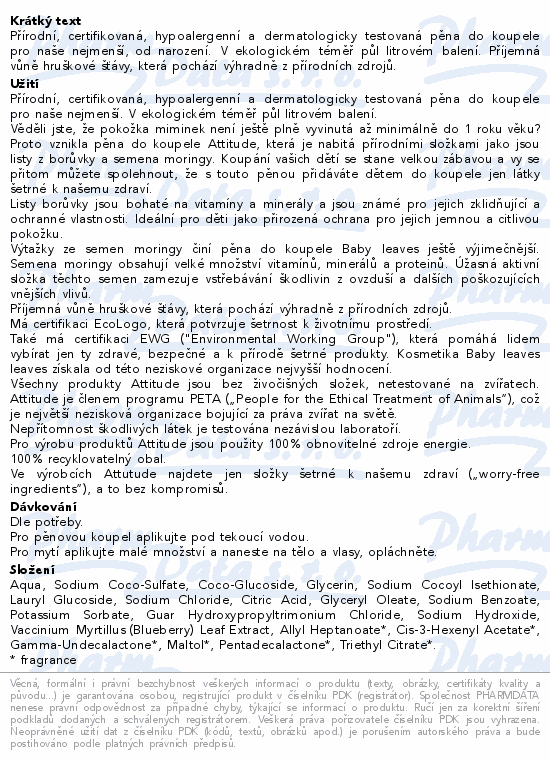 Přírodní, certifikovaná, hypoalergenní a dermatologicky testovaná pěna do koupele pro naše nejmenší, od narození. V ekologickém téměř půl litrovém balení. Příjemná vůně hruškové šťávy, která pochází výhradně z přírodních zdrojů.
