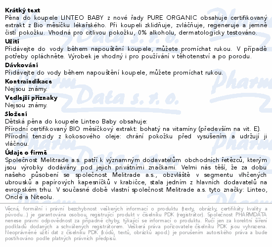 Pěna do koupele LINTEO BABY z nové řady PURE ORGANIC obsahuje certifikovaný extrakt z Bio měsíčku lékařského. Při koupeli zklidňuje, zvláčňuje, regeneruje a jemně čistí pokožku. Vhodná pro citlivou pokožku, 0% alkoholu, dermatologicky testováno.
