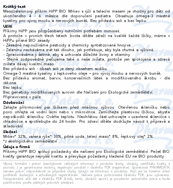 Masozeleninový příkrm HiPP BIO Mrkev s rýží a telecím masem je vhodný pro děti od ukončeného 4 - 6. měsíce dle doporučení pediatra. Obsahuje omega-3 mastné kyseliny pro vývoj mozku a nervových buněk. Bez přídavku soli a bez lepku.