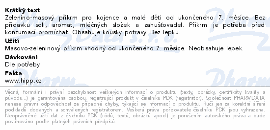 Zelenino-masový příkrm pro kojence a malé děti od ukončeného 7. měsíce. Bez přídavku soli, aromat, mléčných složek a zahušťovadel. Příkrm je potřeba před konzumací promíchat. Obsahuje kousky potravy. Bez lepku.