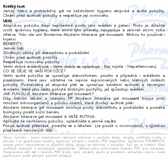 BIODERMA Atoderm Intensive Gel moussant 500 ml je tekutý čisticí gel určený na suchou až atopickou pokožku těla i obličeje kojenců, dětí a dospělých.