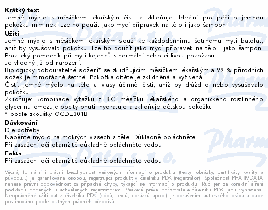 Jemné mýdlo s měsíčkem lékařským čistí a zklidňuje. Ideální pro péči o jemnou pokožku miminek. Lze ho použít jako mycí přípravek na tělo i jako šampon.