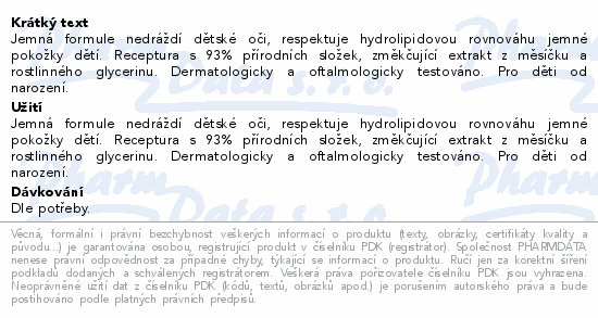 Jemná formule nedráždí dětské oči, respektuje hydrolipidovou rovnováhu jemné pokožky dětí. Receptura s 93% přírodních složek, změkčující extrakt z měsíčku a rostlinného glycerinu. Dermatologicky a oftalmologicky testováno. Pro děti od narození.