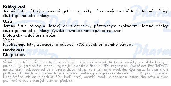 Jemný čisticí tělový a vlasový gel s organicky pěstovaným avokádem. Jemně pěnivý čisticí gel na tělo a vlasy.