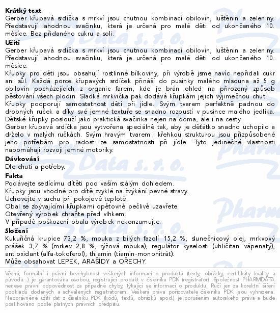 Gerber křupavá srdíčka s mrkví jsou chutnou kombinací obilovin, luštěnin a zeleniny. Představují lahodnou svačinku, která je určená pro malé děti od ukončeného 10. měsíce. Bez přidaného cukru a soli.