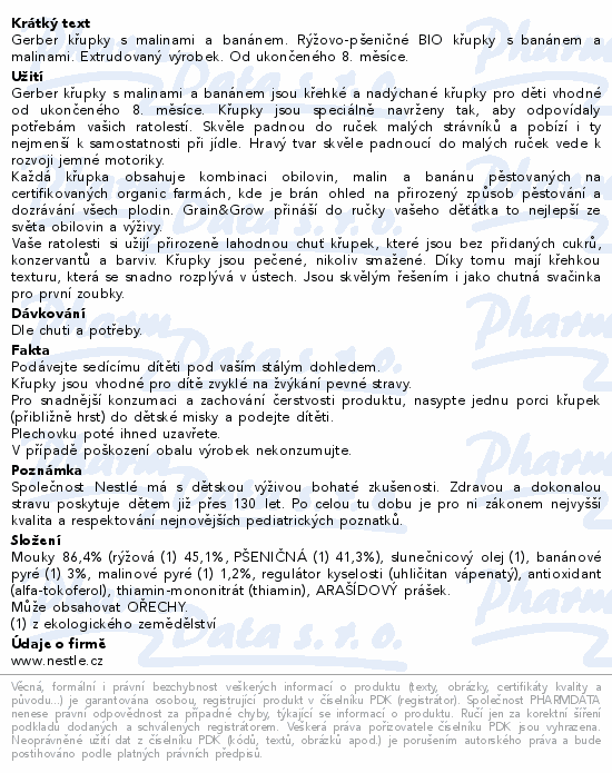 Gerber křupky s malinami a banánem. Rýžovo-pšeničné BIO křupky s banánem a malinami. Extrudovaný výrobek. Od ukončeného 8. měsíce.