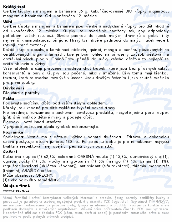Gerber křupky s mangem a banánem 35 g. Kukuřično-ovesné BIO křupky s quinoou, mangem a banánem. Od ukončeného 12. měsíce.
