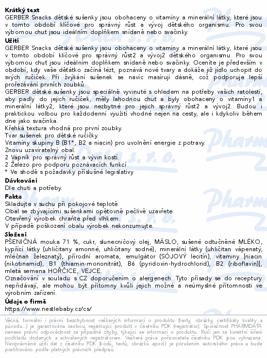 GERBER Snacks dětské sušenky jsou obohaceny o vitamíny a minerální látky, které jsou v tomto období klíčové pro správný růst a vývoj dětského organismu. Pro svou výbornou chuť jsou ideálním doplňkem snídaně nebo svačinky.