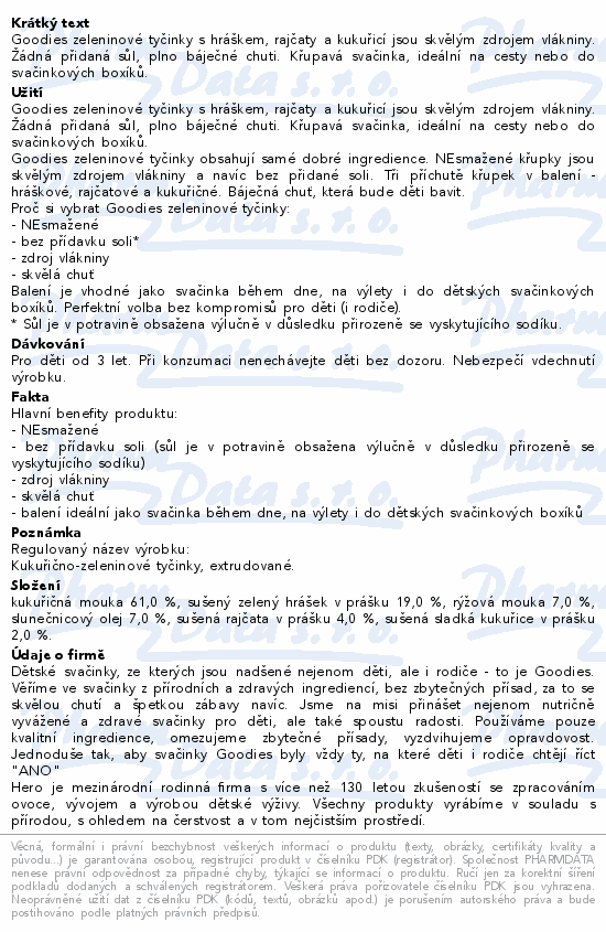 Goodies zeleninové tyčinky s hráškem, rajčaty a kukuřicí jsou skvělým zdrojem vlákniny. Žádná přidaná sůl, plno báječné chuti. Křupavá svačinka, ideální na cesty nebo do svačinkových boxíků.