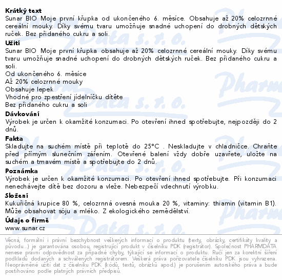 Sunar BIO Moje první křupka od ukončeného 6. měsíce. Obsahuje až 20% celozrnné cereální mouky. Díky svému tvaru umožňuje snadné uchopení do drobných dětských ruček. Bez přidaného cukru a soli.