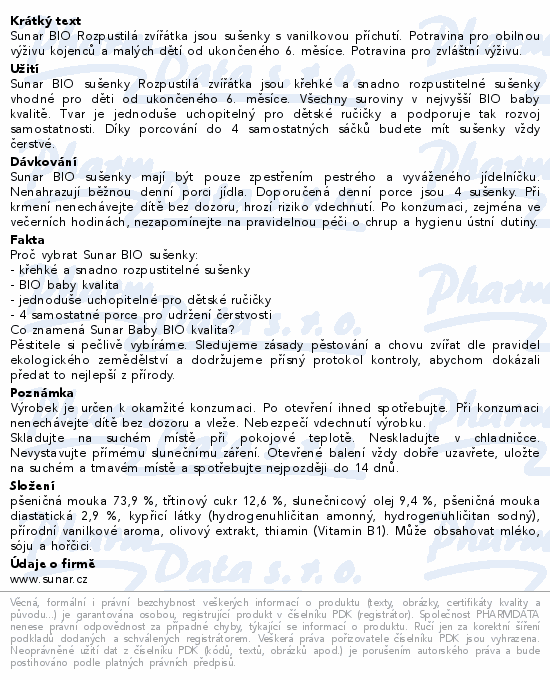Sunar BIO Rozpustilá zvířátka jsou sušenky s vanilkovou příchutí. Potravina pro obilnou výživu kojenců a malých dětí od ukončeného 6. měsíce. Potravina pro zvláštní výživu.