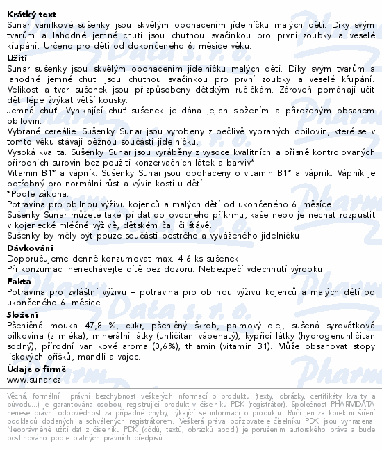 Sunar vanilkové sušenky jsou skvělým obohacením jídelníčku malých dětí. Díky svým tvarům a lahodné jemné chuti jsou chutnou svačinkou pro první zoubky a veselé křupání. Určeno pro děti od dokončeného 6. měsíce věku.