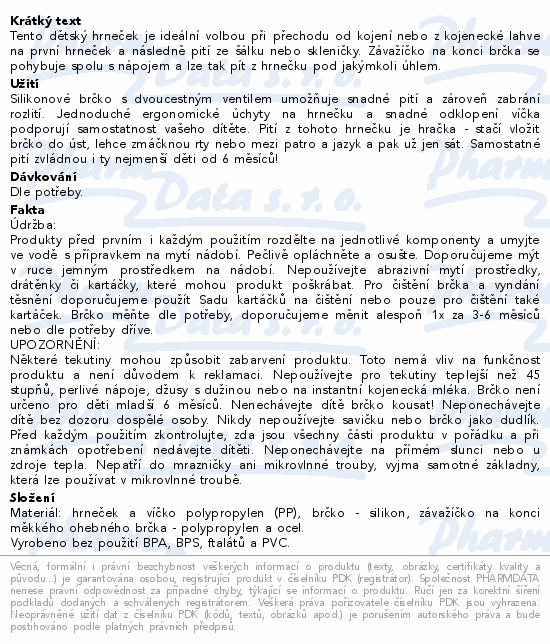 Tento dětský hrneček je ideální volbou při přechodu od kojení nebo z kojenecké lahve na první hrneček a následně pití ze šálku nebo skleničky. Závažíčko na konci brčka se pohybuje spolu s nápojem a lze tak pít z hrnečku pod jakýmkoli úhlem.