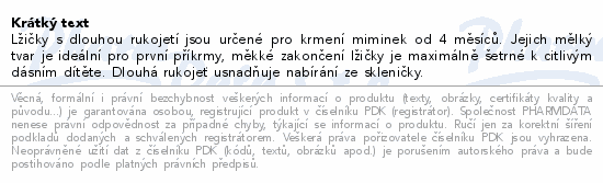 Lžičky s dlouhou rukojetí jsou určené pro krmení miminek od 4 měsíců. Jejich mělký tvar je ideální pro první příkrmy, měkké zakončení lžičky je maximálně šetrné k citlivým dásním dítěte. Dlouhá rukojeť usnadňuje nabírání ze skleničky.