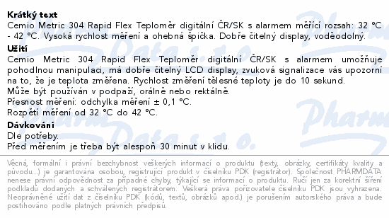 Cemio Metric 304 Rapid Flex Teploměr digitální ČR/SK s alarmem měřící rozsah: 32 °C - 42 °C. Vysoká rychlost měření a ohebná špička. Dobře čitelný display, voděodolný.