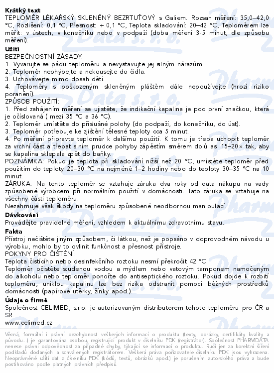 TEPLOMĚR LÉKAŘSKÝ SKLENĚNÝ BEZRTUŤOVÝ s Galiem. Rozsah měření: 35,0–42,0 °C,Rozlišení: 0,1 °C,Přesnost: + 0,1 °C, Teplota skladování: 20–42 °C,Teploměrem lze měřit: v ústech, v konečníku nebo v podpaží (doba měření 3-5 minut, dle způsobu měření).