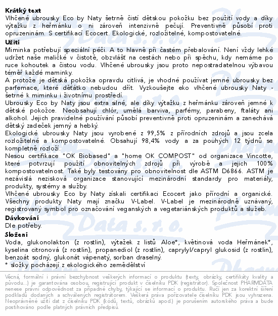 Vlhčené ubrousky Eco by Naty šetrně čistí dětskou pokožku bez použití vody a díky výtažku z heřmánku o ni zároveň intenzivně pečují. Preventivně působí proti opruzeninám. S certifikací Ecocert. Ekologické, rozložitelné, kompostovatelné.