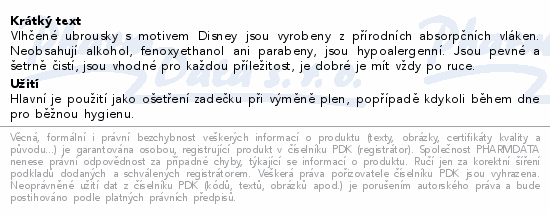 Vlhčené ubrousky s motivem Disney jsou vyrobeny z přírodních absorpčních vláken. Neobsahují alkohol, fenoxyethanol ani parabeny, jsou hypoalergenní. Jsou pevné a šetrně čistí, jsou vhodné pro každou příležitost, je dobré je mít vždy po ruce.