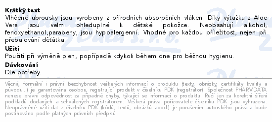 Vlhčené ubrousky jsou vyrobeny z přírodních absorpčních vláken. Díky výtažku z Aloe Vera jsou velmi ohleduplné k dětské pokožce. Neobsahují alkohol, fenoxyethanol,parabeny, jsou hypoalergenní. Vhodné pro každou příležitost, nejen při přebalování děťátka.