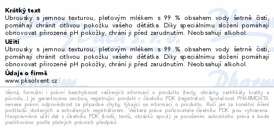 Ubrousky s jemnou texturou, pleťovým mlékem s 99 % obsahem vody šetrně čistí, pomáhají chránit citlivou pokožku vašeho děťátka. Díky speciálnímu složení pomáhají obnovovat přirozené pH pokožky, chrání ji před zarudnutím. Neobsahují alkohol.