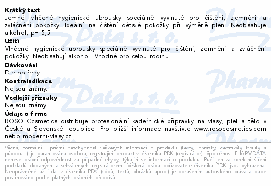 Jemné vlhčené hygienické ubrousky speciálně vyvinuté pro čištění, zjemnění a zvláčnění pokožky. Ideální na čištění dětské pokožky při výměně plen. Neobsahuje alkohol, pH 5,5.