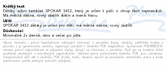 Dětšký zubní kartáček SPOKAR 3432, který je určen k péči o chrup těch nejmenších. Má měkká vlákna, rovný zástřih štětin a menší hlavu.