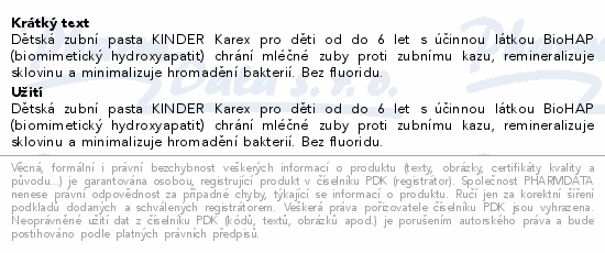 Dětská zubní pasta KINDER Karex pro děti od 0 do 6 let s účinnou látkou BioHAP (biomimetický hydroxyapatit) chrání mléčné zuby proti zubnímu kazu, remineralizuje sklovinu a minimalizuje hromadění bakterií. Bez fluoridu.