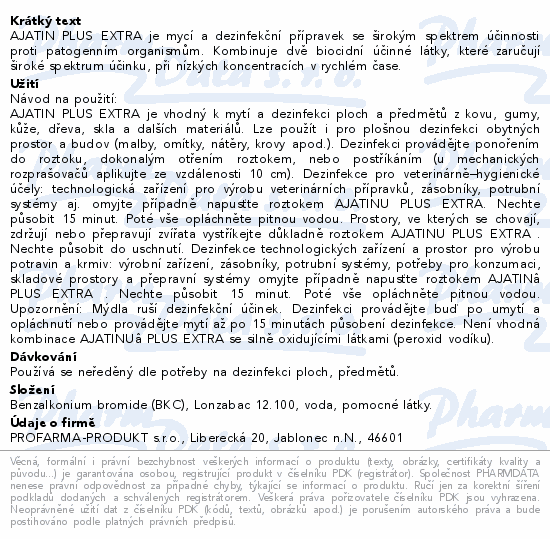 AJATIN PLUS EXTRA je mycí a dezinfekční přípravek se širokým spektrem účinnosti proti patogenním organismům. Kombinuje dvě biocidní účinné látky, které zaručují široké spektrum účinku, při nízkých koncentracích v rychlém čase.