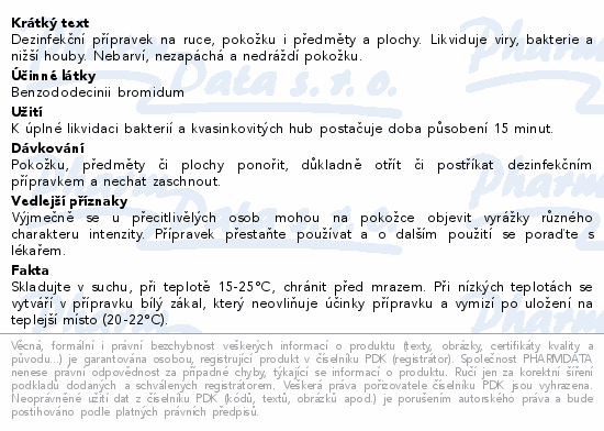 Dezinfekční přípravek na ruce, pokožku i předměty a plochy. Likviduje viry, bakterie a nižší houby. Nebarví, nezapáchá a nedráždí pokožku.