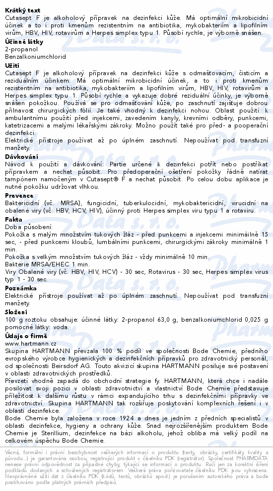 Cutasept F je alkoholový přípravek na dezinfekci kůže. Má optimální mikrobicidní účinek a to i proti kmenům rezistentním na antibiotika, mykobakteriím a lipofilním virům, HBV, HIV, rotavirům a Herpes simplex typu 1. Působí rychle, je výborně snášen.