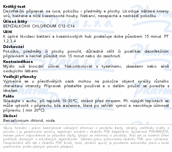 Dezinfekční přípravek na ruce, pokožku i předměty a plochy. Likviduje některé kmeny virů, bakterie a nižší kvasinkovité houby. Nebarví, nezapáchá a nedráždí pokožku.