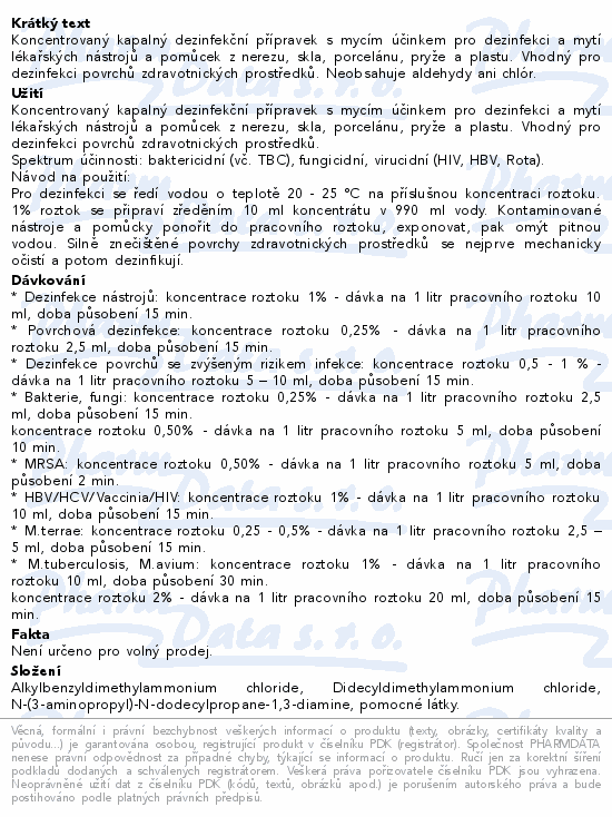 Koncentrovaný kapalný dezinfekční přípravek s mycím účinkem pro dezinfekci a mytí lékařských nástrojů a pomůcek z nerezu, skla, porcelánu, pryže a plastu. Vhodný pro dezinfekci povrchů zdravotnických prostředků. Neobsahuje aldehydy ani chlór.
