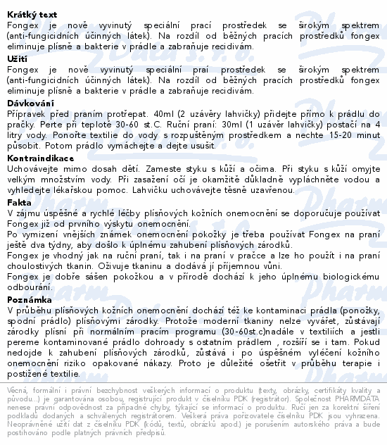 Fongex je nově vyvinutý speciální prací prostředek se širokým spektrem (anti-fungicidních účinných látek). Na rozdíl od běžných pracích prostředků fongex eliminuje plísně a bakterie v prádle a zabraňuje recidivám.