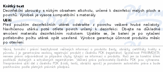 Dezinfekční ubrousky s nízkým obsahem alkoholu, určené k dezinfekci malých ploch a povrchů. Výrobek je vysoce kompatibilní s materiály.