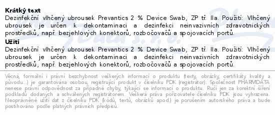 Dezinfekční vlhčený ubrousek Prevantics 2 % Device Swab, ZP tř. IIa. Použití: Vlhčený ubrousek je určen k dekontaminaci a dezinfekci neinvazivních zdravotnických prostředků, např. bezjehlových konektorů, rozbočovačů a spojovacích portů.