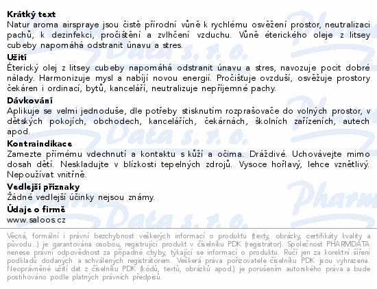 Natur aroma airspraye jsou čistě přírodní vůně k rychlému osvěžení prostor, neutralizaci pachů, k dezinfekci, pročištění a zvlhčení vzduchu. Vůně éterického oleje z litsey cubeby napomáhá odstranit únavu a stres.