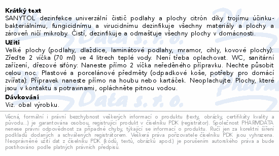 SANYTOL dezinfekce univerzální čistič podlahy a plochy citrón díky trojímu účinku- bakteriálnímu, fungicidnímu a virucidnímu dezinfikuje všechny materiály a plochy a zároveň ničí mikroby. Čistí, dezinfikuje a odmašťuje všechny plochy v domácnosti.