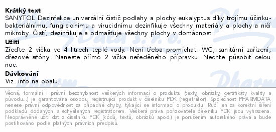 SANYTOL Dezinfekce univerzální čistič podlahy a plochy eukalyptus díky trojímu účinku- bakteriálnímu, fungicidnímu a virucidnímu dezinfikuje všechny materiály a plochy a ničí mikroby. Čistí, dezinfikuje a odmašťuje všechny plochy v domácnosti.
