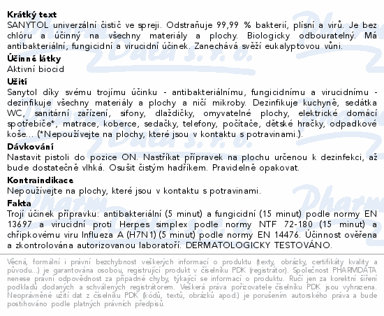 SANYTOL univerzální čistič ve spreji. Odstraňuje 99,99 % bakterií, plísní a virů. Je bez chlóru a účinný na všechny povrchy. Biologicky odbouratelný. Má antibakteriální, fungicidní a virucidní účinek, proti chřipkovému viru Influeza A (H7N1).