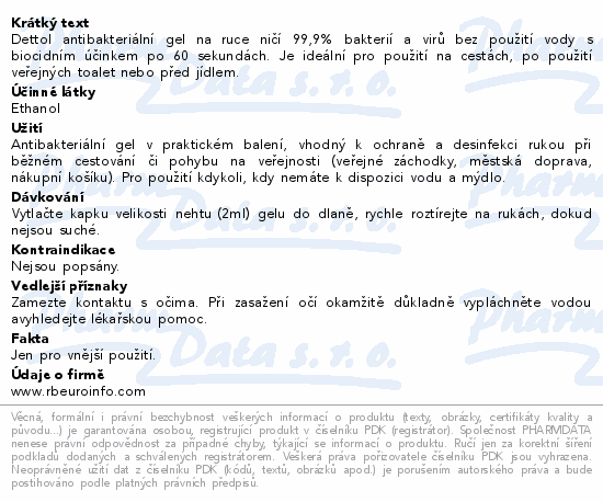 Dettol antibakteriální gel na ruce ničí 99,9% bakterií a virů bez použití vody s biocidním účinkem po 60 sekundách. Je ideální pro použití na cestách, po použití veřejných toalet nebo před jídlem.