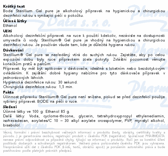 Bode Sterillium Gel pure je alkoholový přípravek na hygienickou a chirurgickou dezinfekci rukou s vynikající péčí o pokožku.